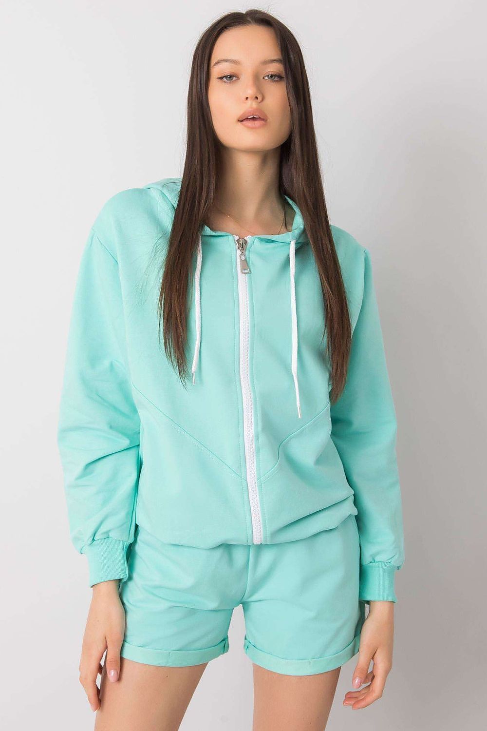Set de trening format dintr-un tricou și pantaloni scurți. Hanorac cu fermoar și glugă. Pantaloni scurți cu bandă elastică și cravată în talie, buzunare laterale.